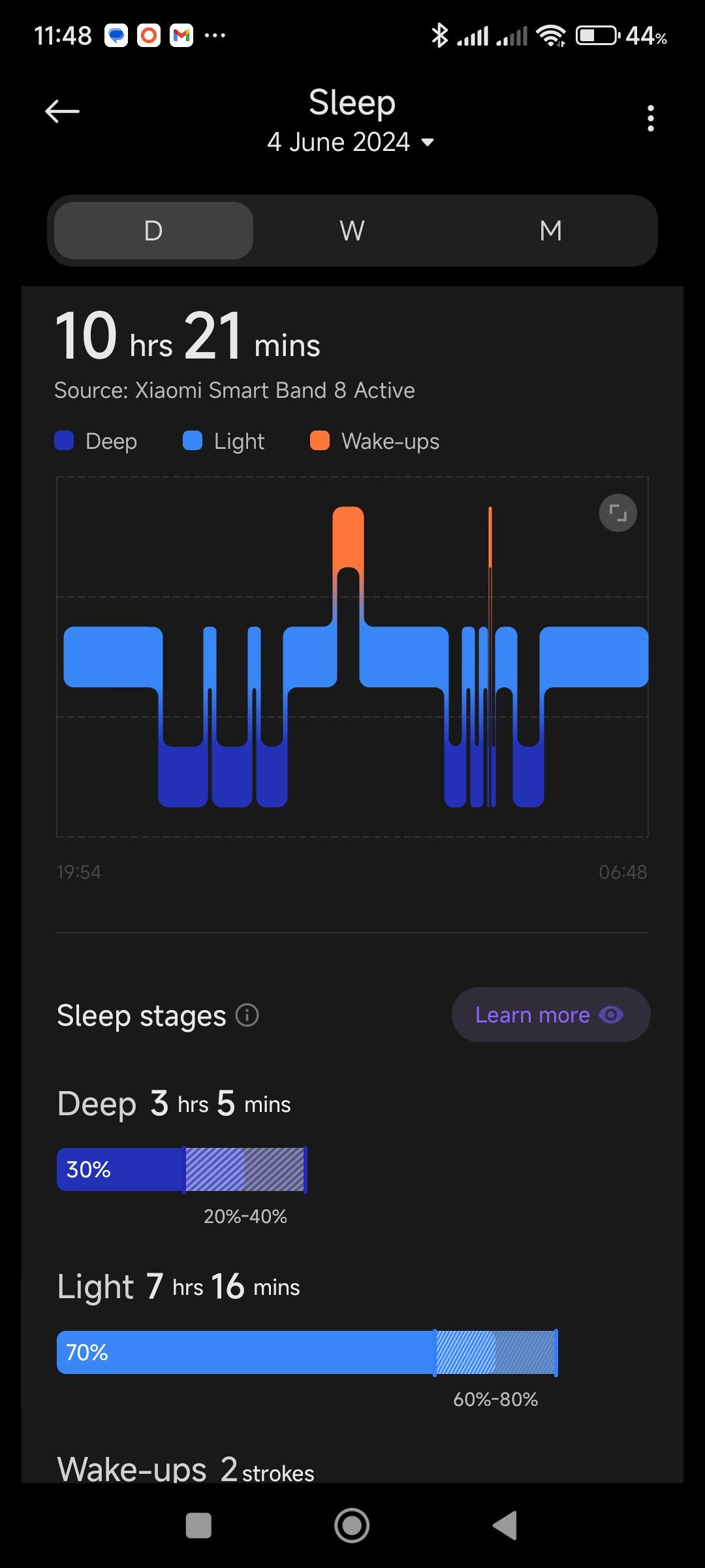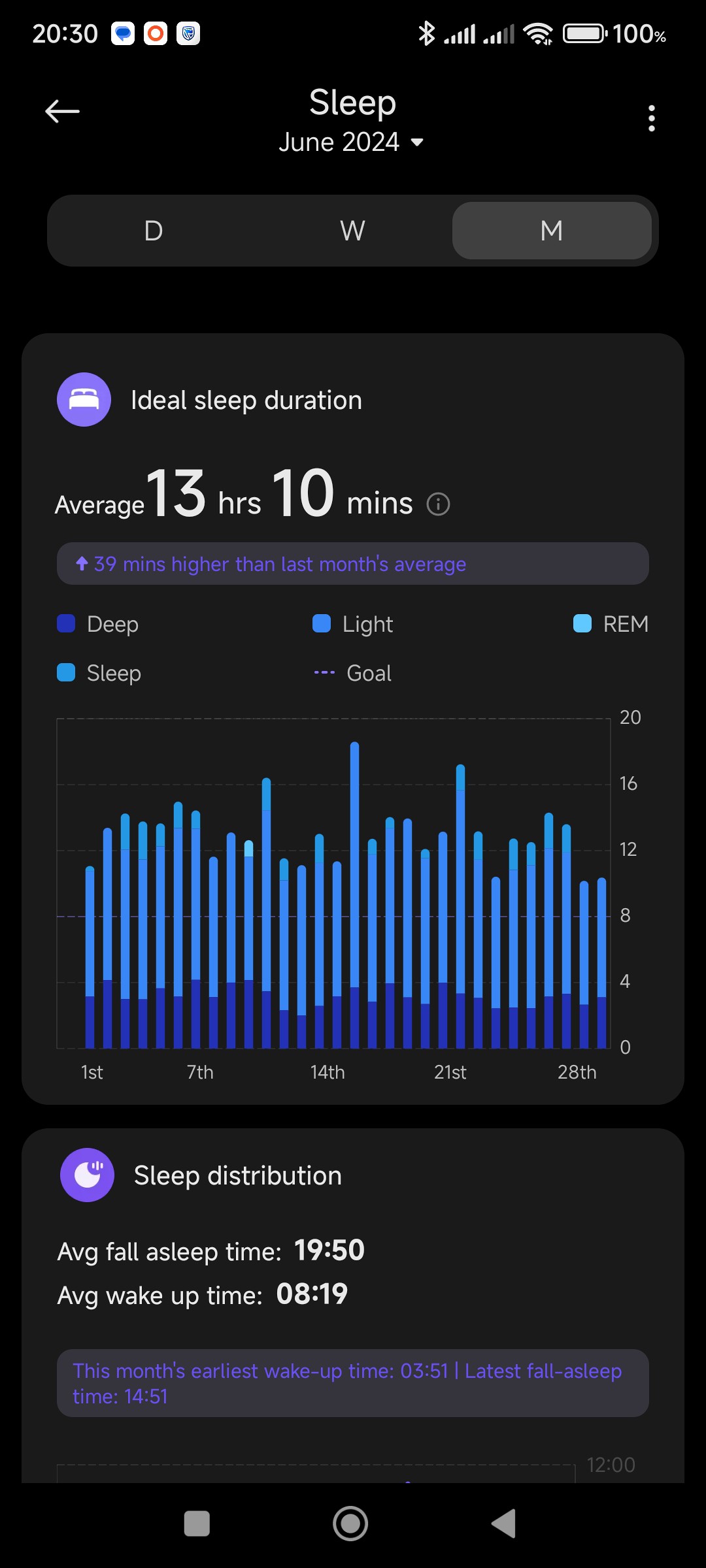 This graph shows that even though my periods of deep sleep are not good, they are quite consistent over a month. What the image also shows is that my average sleep time is 13 hours and 10 minutes, which is really not the case. As I mentioned earlier, this is due to the watch regarding certain quiet moments as "light sleep"!