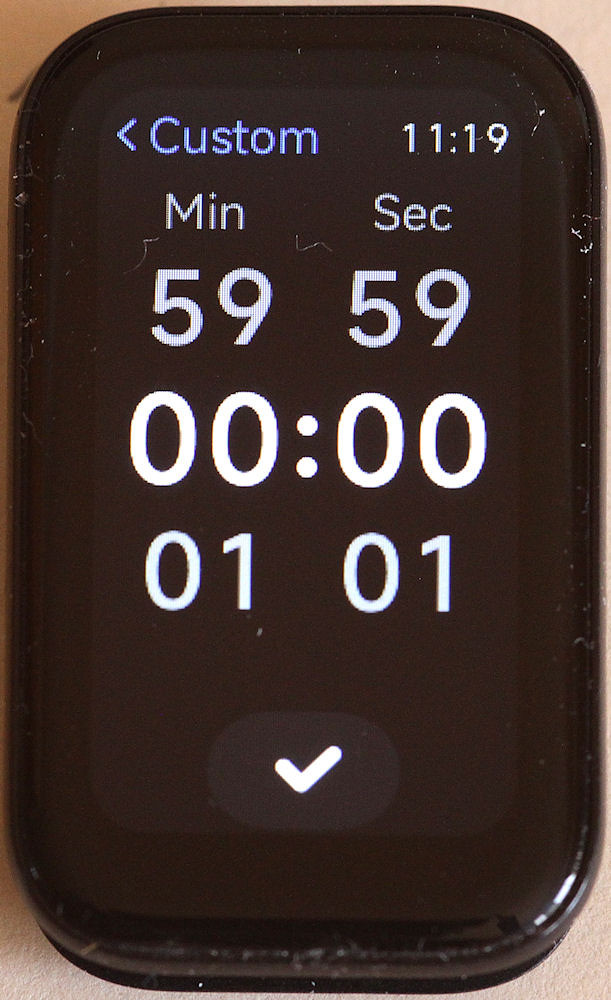 A custom timer is set with Android "scroll wheels". First the hours are set by scrolling up or down then tapping on the tick. On the next screen the minutes are set by scrolling up or down on the left side (Min), then set the seconds on the right side (Sec).