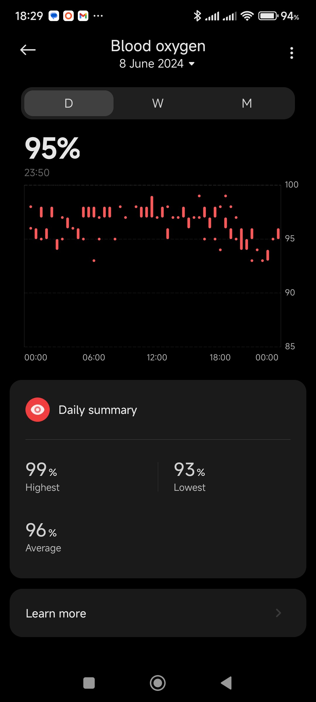 The SpO2 readings from the watch were a big disappointment. They were consistently way too high when compared with my fingertip pulse oximeter. It shows oxygen levels to be normal (95%) to high (99%). On occasions they do actually match the values shown on the oximeter, but I have yet to find the conditions under which this happens.