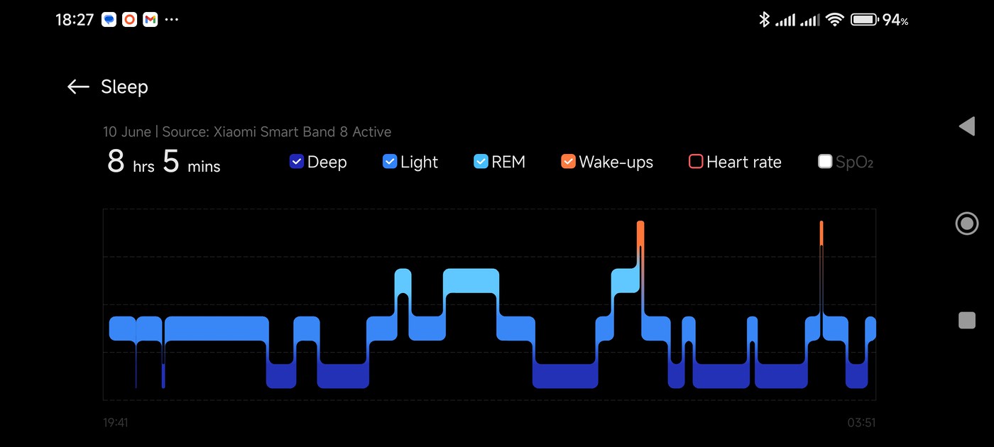 I disabled the Advanced Sleep Tracker after about eight hours as it was very hard on the battery life - it used about 16% of the battery in this time. This is very poor when compared with less than 9% in a full day without the REM tracker. It also disabled continuous monitoring of SpO2, even though this was still shown as enabled in the app.