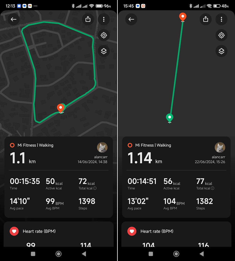 If the paired phone is carried along on the walk, it is able to use its GPS to track the route walked. I was hoping that this GPS tracking would lead to a more accurate measure of the stride length, but this was unfortunately not the case.
