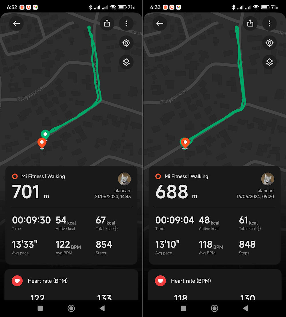 Showing the activity screens of the same walk on different days