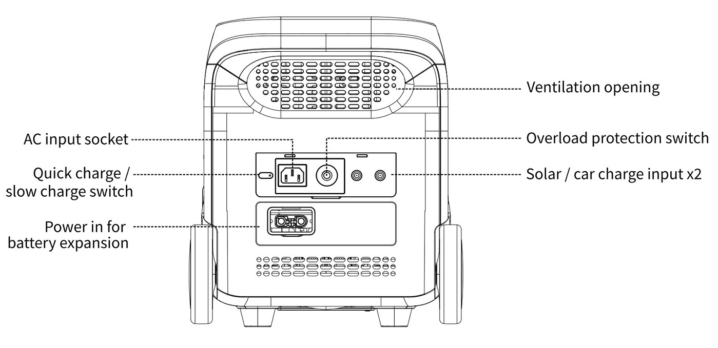 All input ports are located on the rear panel. These include an AC inlet and two DC7909 ports for solar or car charging (or a suitable DC-DC source). Plugging in a live source will automatically switch on the PS3000.