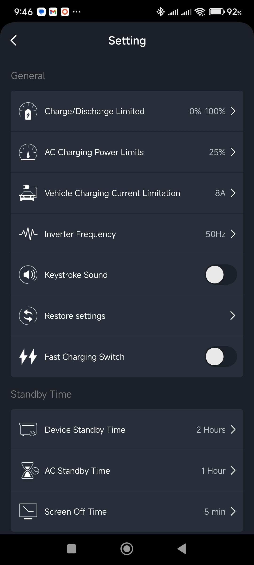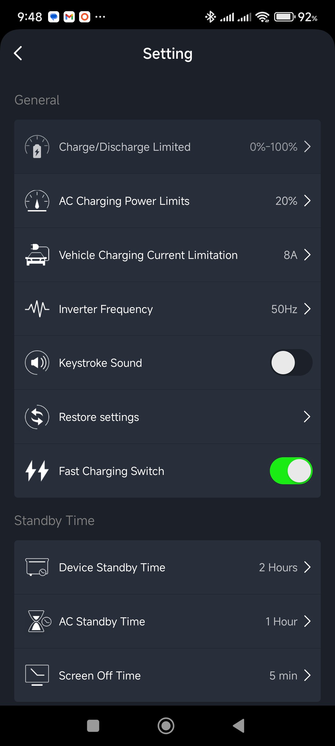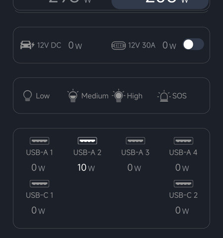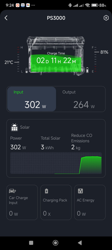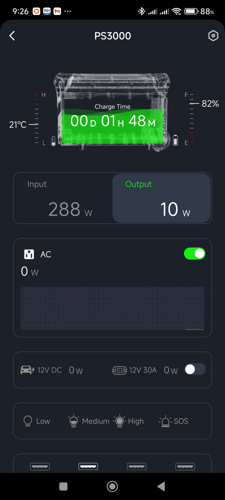 On switching on the PS3000 for the first time, it showed a 96% SoC (which I thought to be quite high for a new device) so I decided to fully charge it before doing any tests. The charging rate was 860 W which also felt rather high, as a new box was supposed to be capped at a low level by default even though the "quick charge" button was enabled. All buttons and sliders related to charging in the app were disabled. This worried me somewhat on reading the following in the manual: