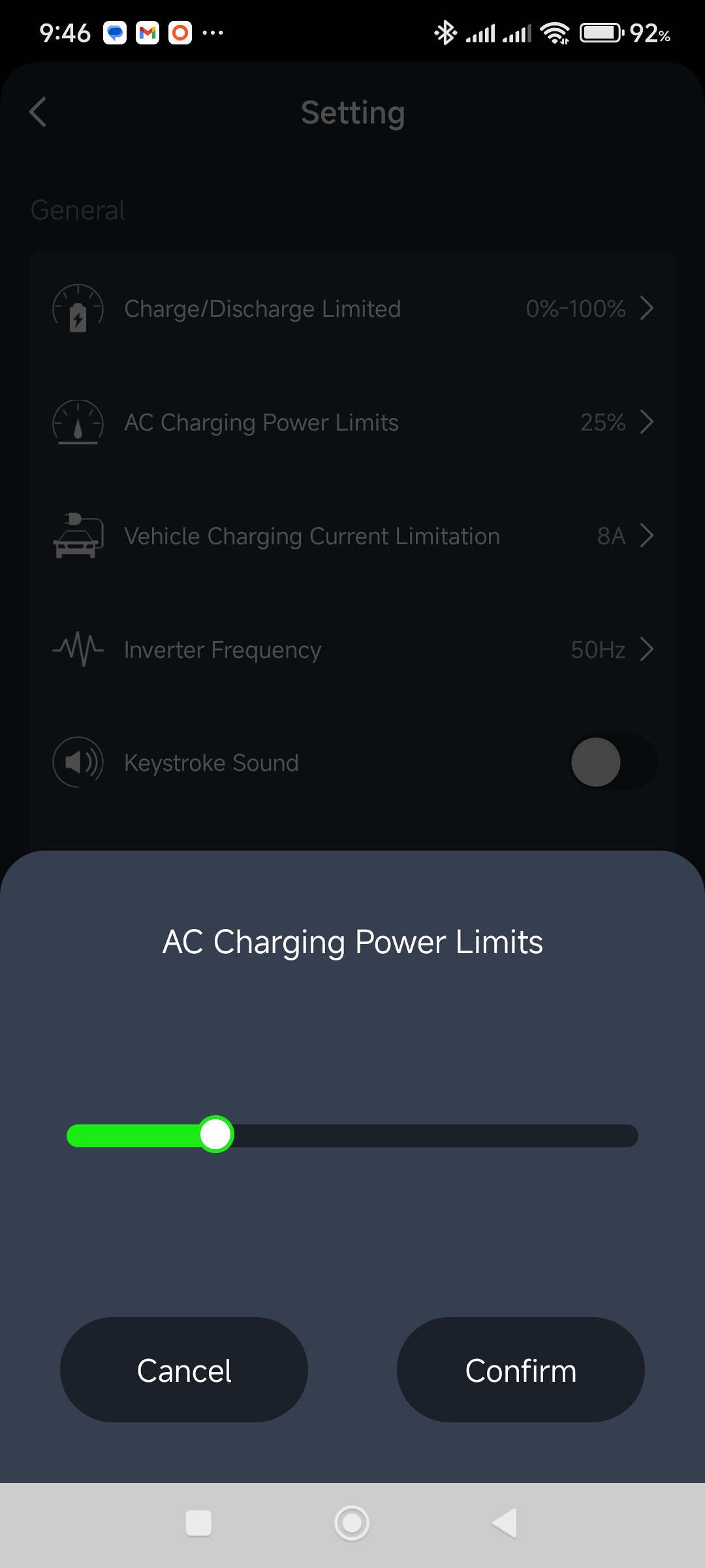 The slider in the AC Charging Power Limits set to 25% in the Hinen app