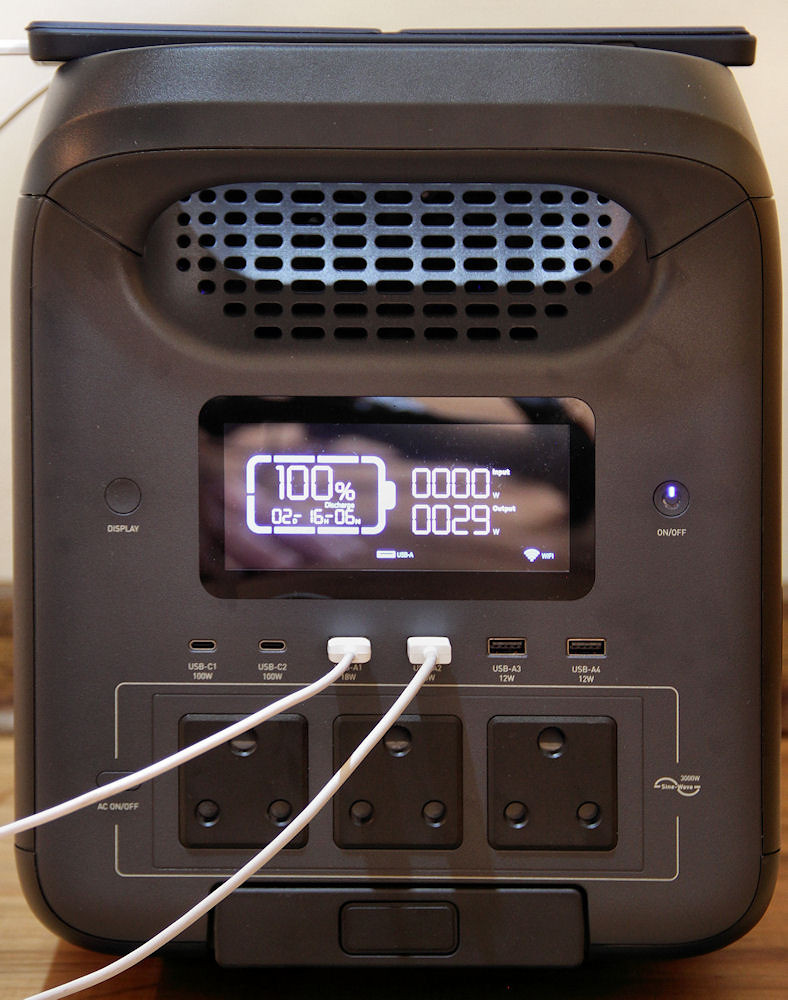 There is no indication as to whether these maximum values apply per port or per pair. However, when charging both a Xiaomi Note 12 and a Samsung A9+ using the fast charge ports, the total output was 29 W (as shown on the display in a photo above). This suggests that each port can deliver close to its specified maximum.