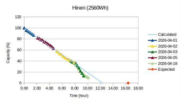 It is also worth noting that the PS3000's own runtime estimate at 100% SoC was approximately 13.5 hours under this load. This corresponds to roughly 82% of the expected runtime, suggesting that even the unit's internal calculations do not reflect the full rated capacity.