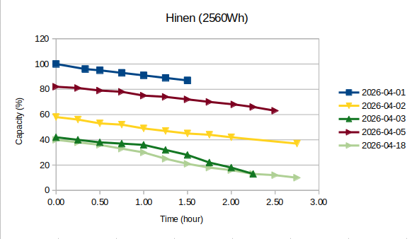This would have been an acceptable result for a unit of this size. However, the behaviour of the dark green curve indicates that this is not representative of the full discharge range, with the unit appearing to reach 0% SoC after just over 10 hours.