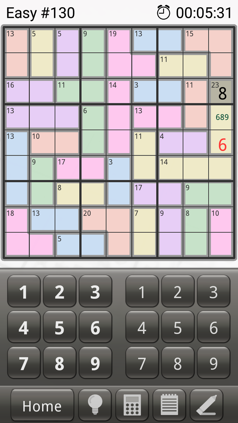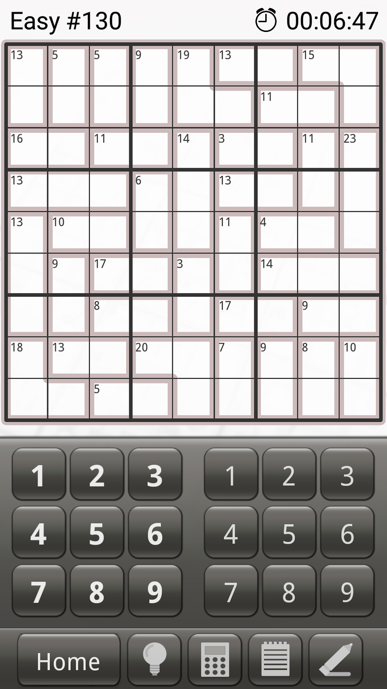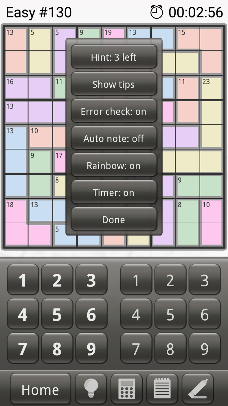 This button removes the colours from the cells. It is sometimes easier to see the cage boundaries when the colours are not present.