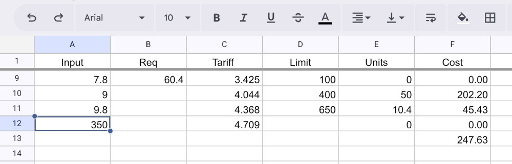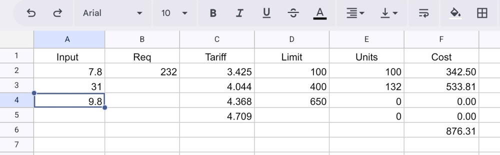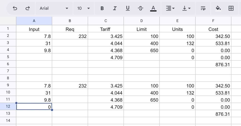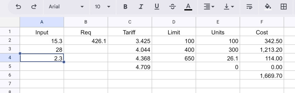 The calculations above demonstrate how the tariffs work, but doing them manually quickly becomes tedious. Fortunately, a spreadsheet is very good at doing sums.