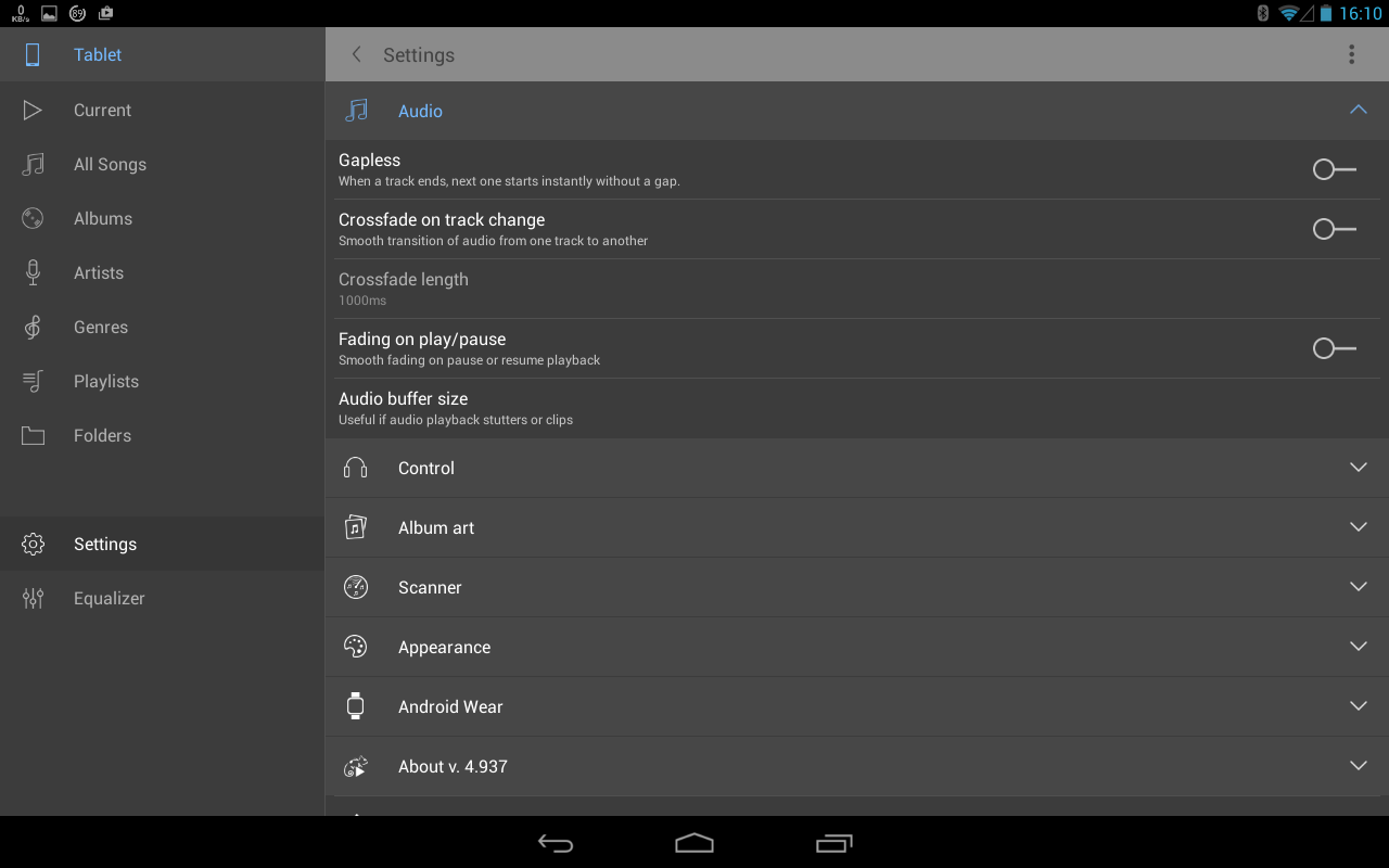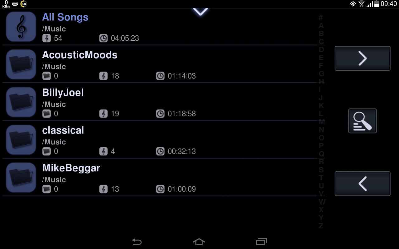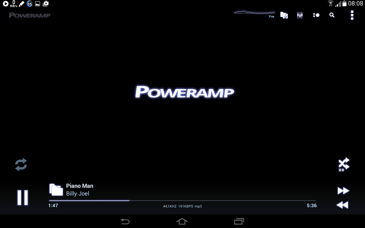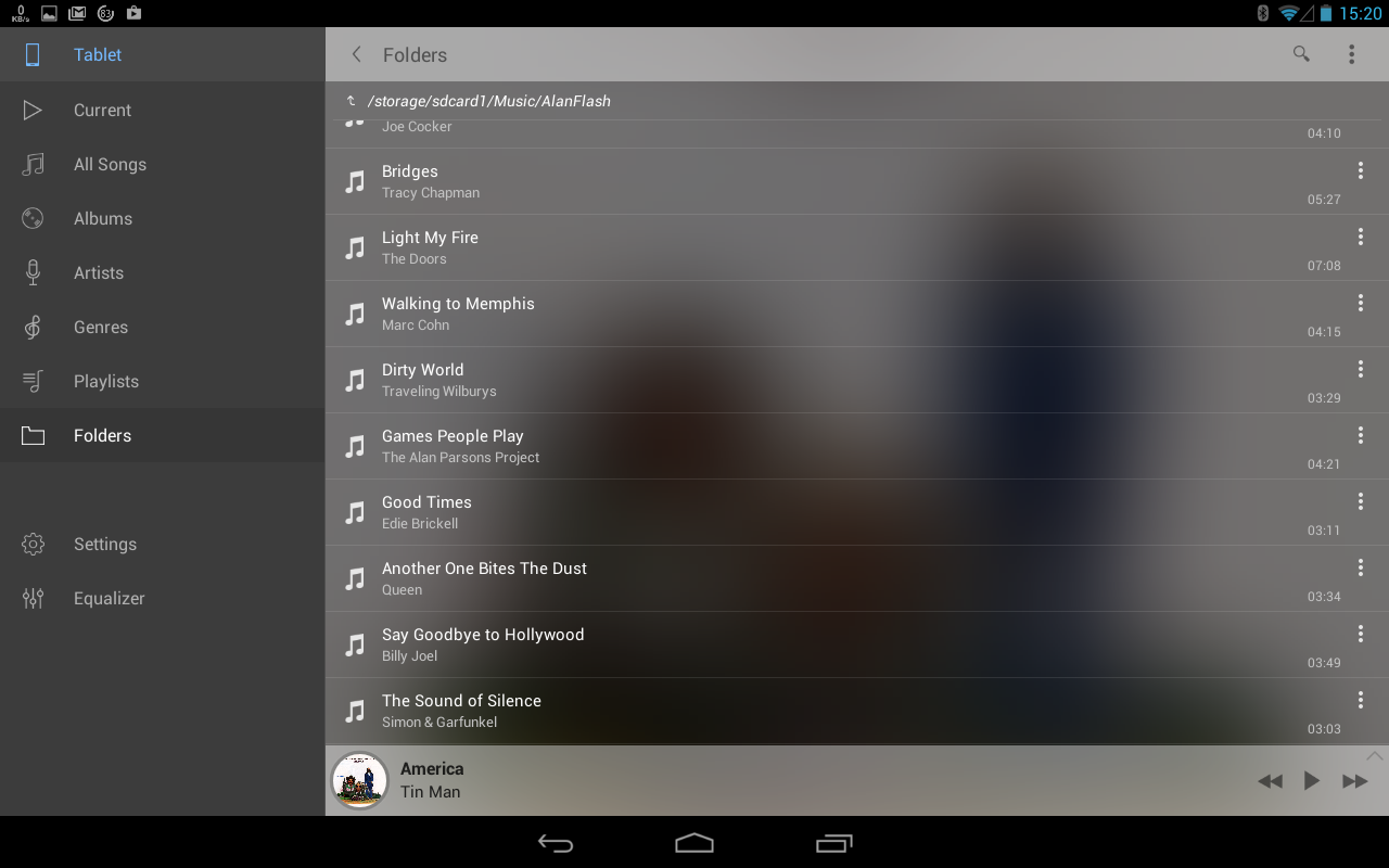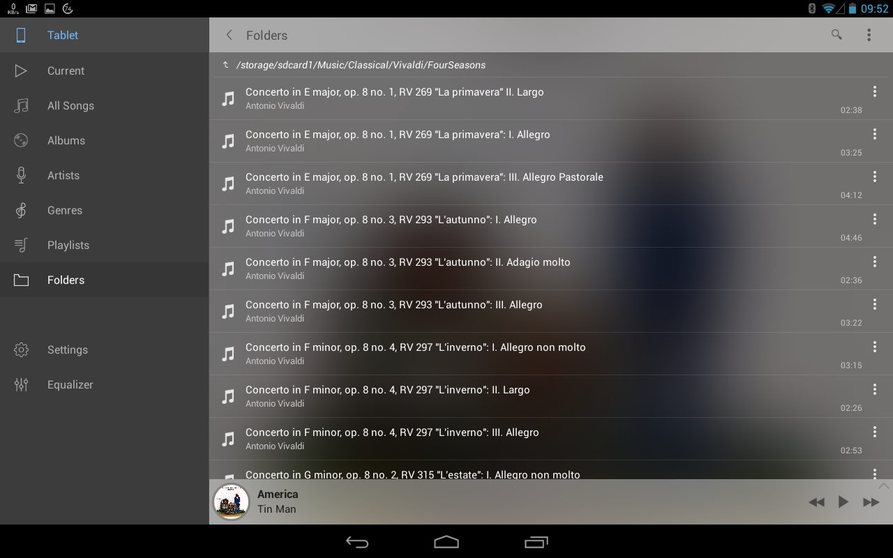 Pi is a fairly decent player, which ticks all the boxes with folders, staying within a selected folders while playing and having a built-in equalizer. Where it falls down completely for me is that many of the screens are portrait only - this is most awkward on the tablet that I am using as a music player.
