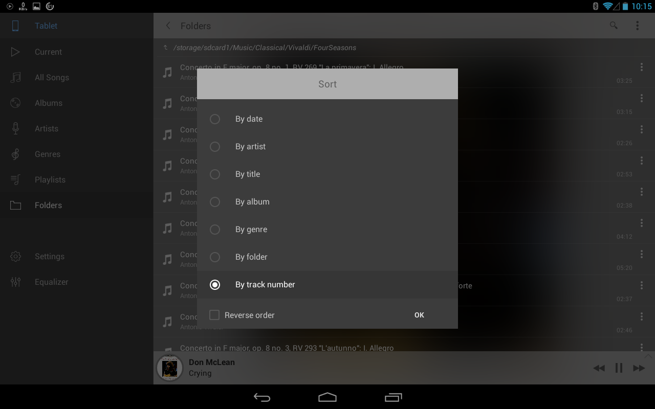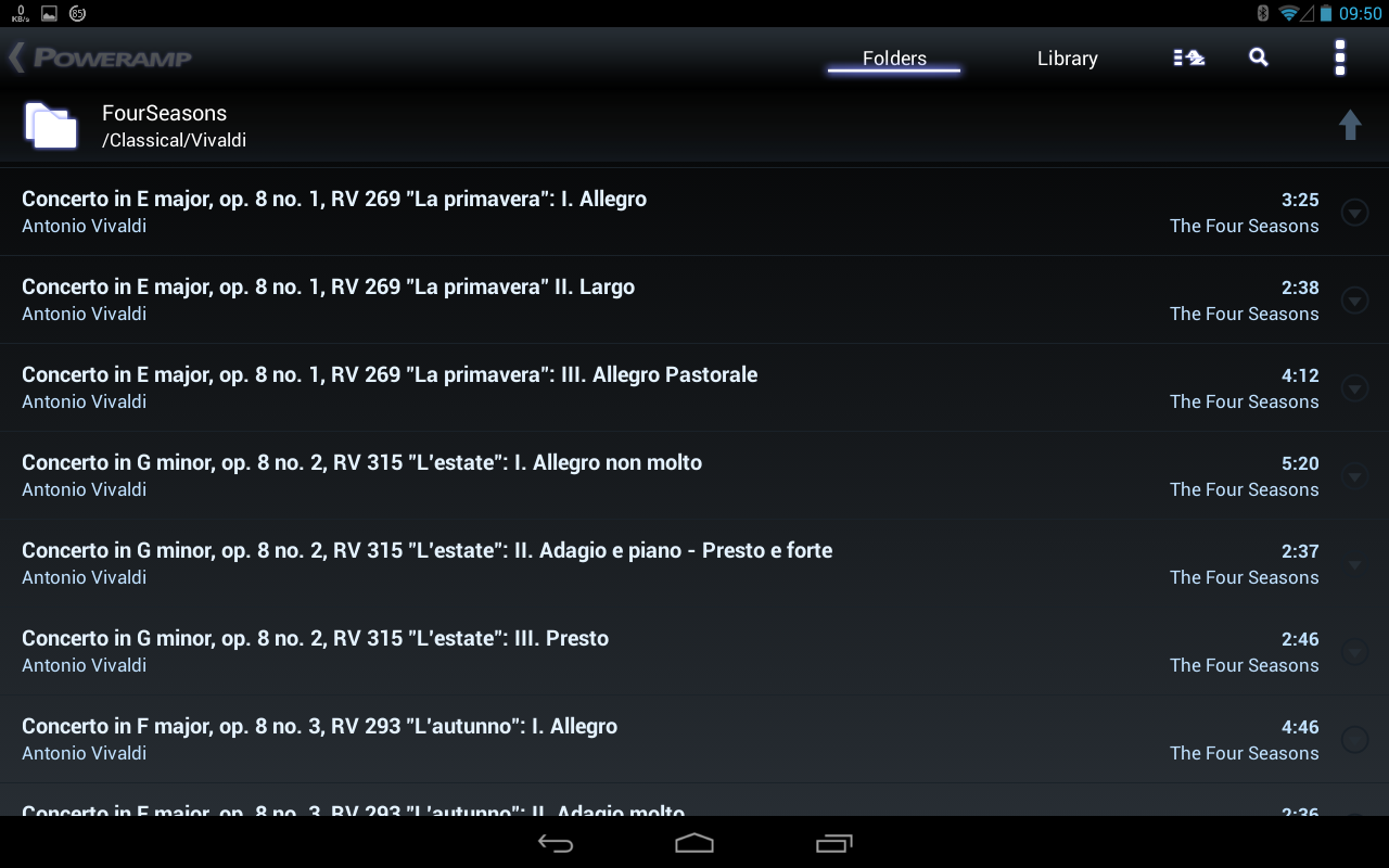 An important criteria for me was to be able to play the tracks in the order as on the CD. I like classical music, and you want to listen to the symphony/concerto in the order it was presented to the world by the composer. Playlists are not an option for me as they are way too much effort to compile. My own folders was the way I wanted to go, as I could move the tracks into their own folders as I was ripping. This means all the filler tracks on the CD went into their own directory and the symphony/concerto into theirs. Thus the app had to have a "play from folder option".
