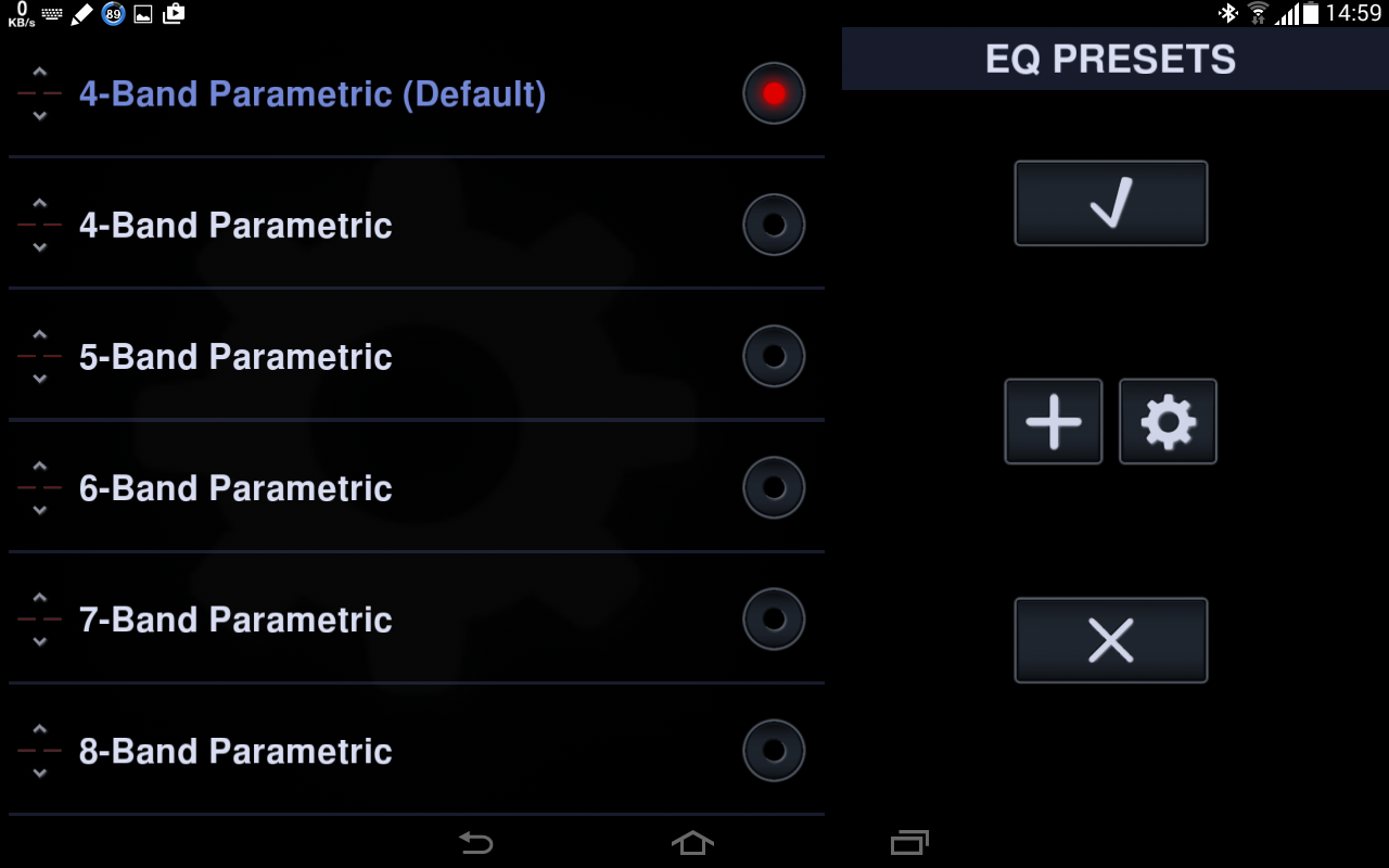 The equalizer band variations from the settings menu