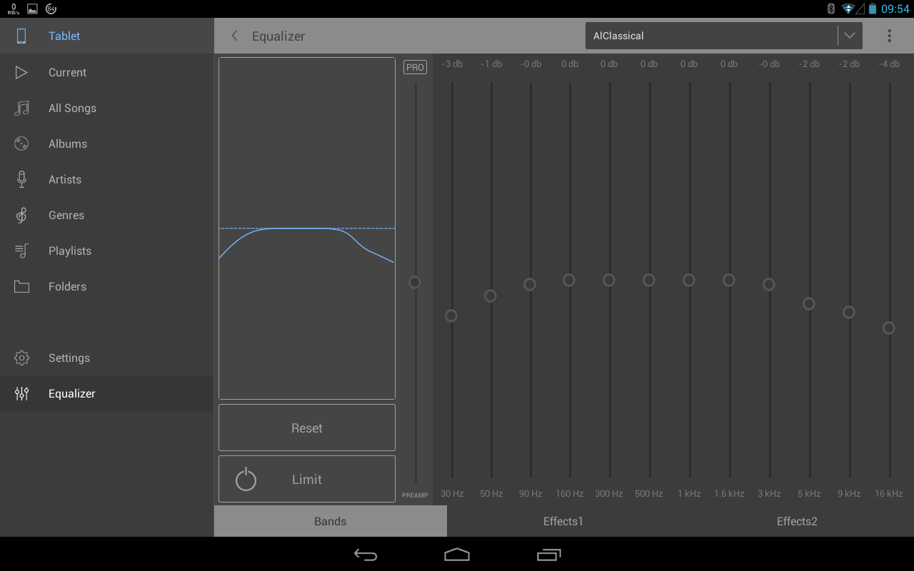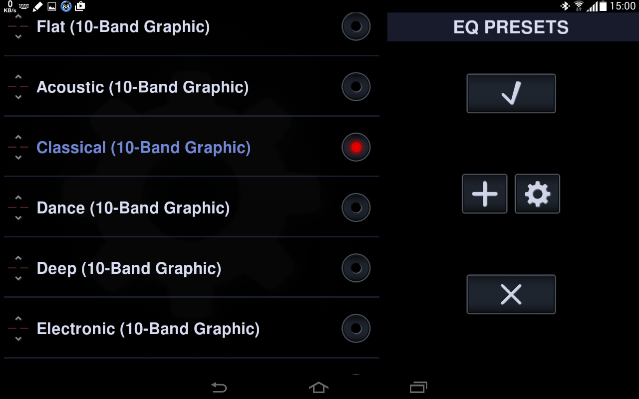 The equalizer screen with the Classical preset selected