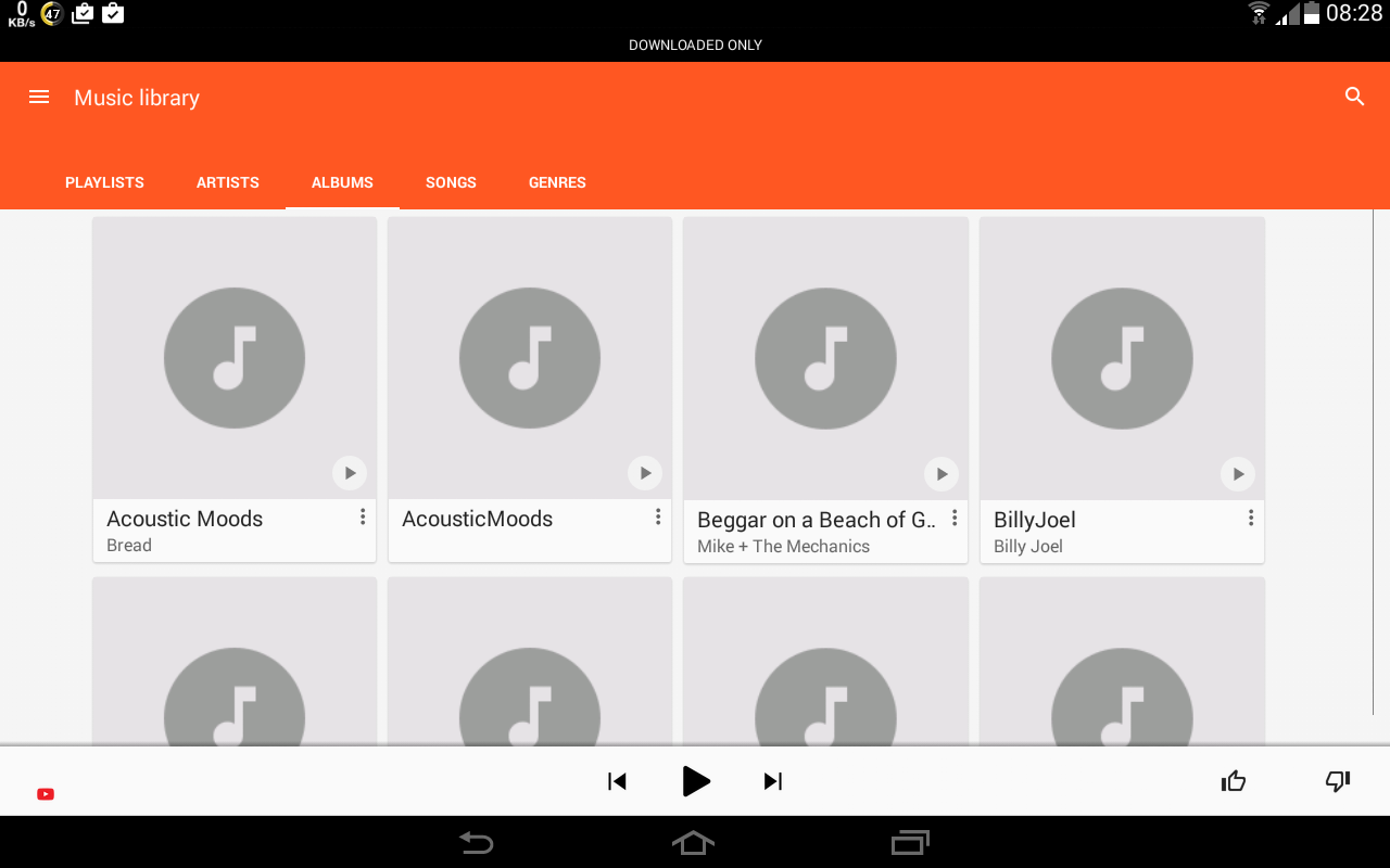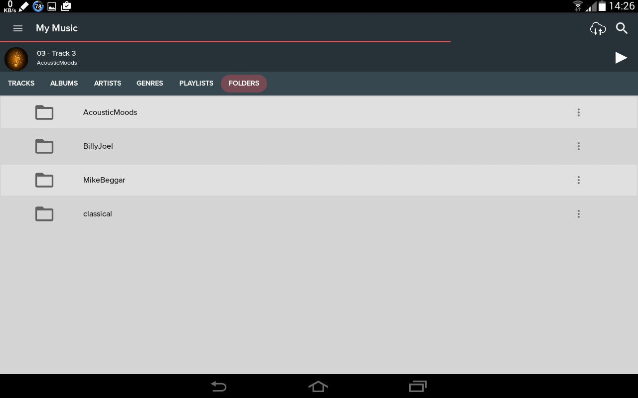 Google Play Music is part of the bloatware added to Android as part of Google's campaign to sell streaming music. It has a very minimalist appearance, following Google's own (really ugly) Material Design. This app ruled itself out immediately by not having a folders option.