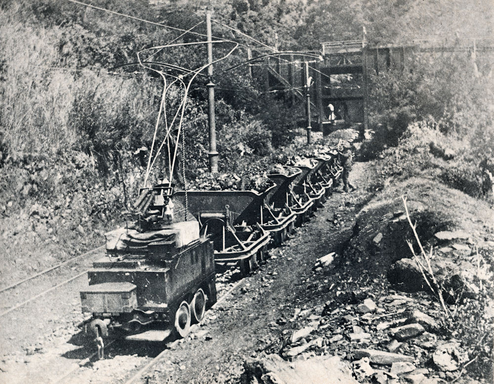 The following picture of the train [1] pulling ore trucks was taken some time in the early 1900s [2].