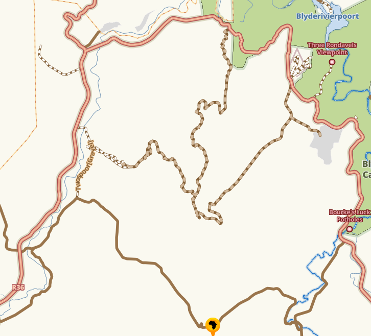 Along the road, there is a turn-off to the north in the vicinity of Kaspersnek Orchards which will take you to the R36 to Ohrigstad. This road is not marked, so you will more than likely miss it (as we did). Why this road is of interest, is that a farmer on this road had a 4x4 trail down the mountains to the R532 near the Blyde River resort. As far as I know, this trail is no longer active but the 4x4 trails website, Tracks 4 Africa, still shows it.