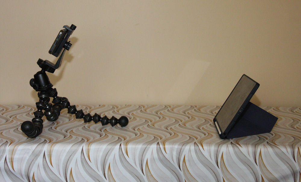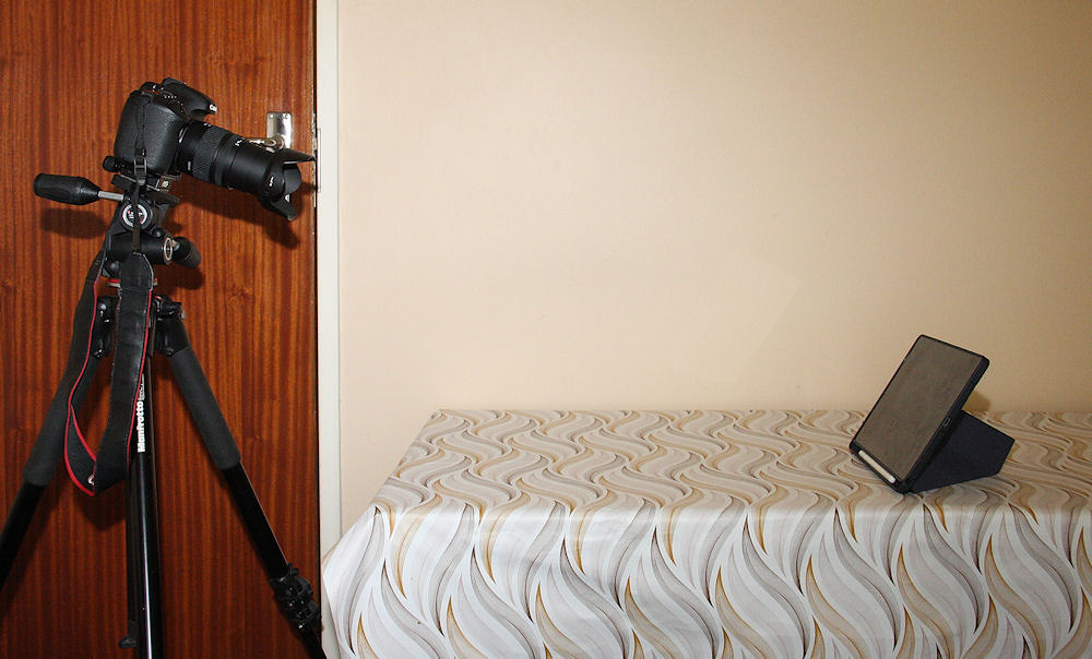 Photographing a glossy surface such as a tablet screen immediately raises the problem of reflections: me, the camera, the tripod, and anything else lurking behind it. Side lighting — whether from a window or an overhead light fitting — can introduce uneven illumination and gradients across the display. These issues were largely controlled by working in a darkened room with a plain, unadorned wall behind the camera. Although not strictly necessary, I also used a remote release so that I was not standing directly behind the camera, removing one more potential reflection from the scene.