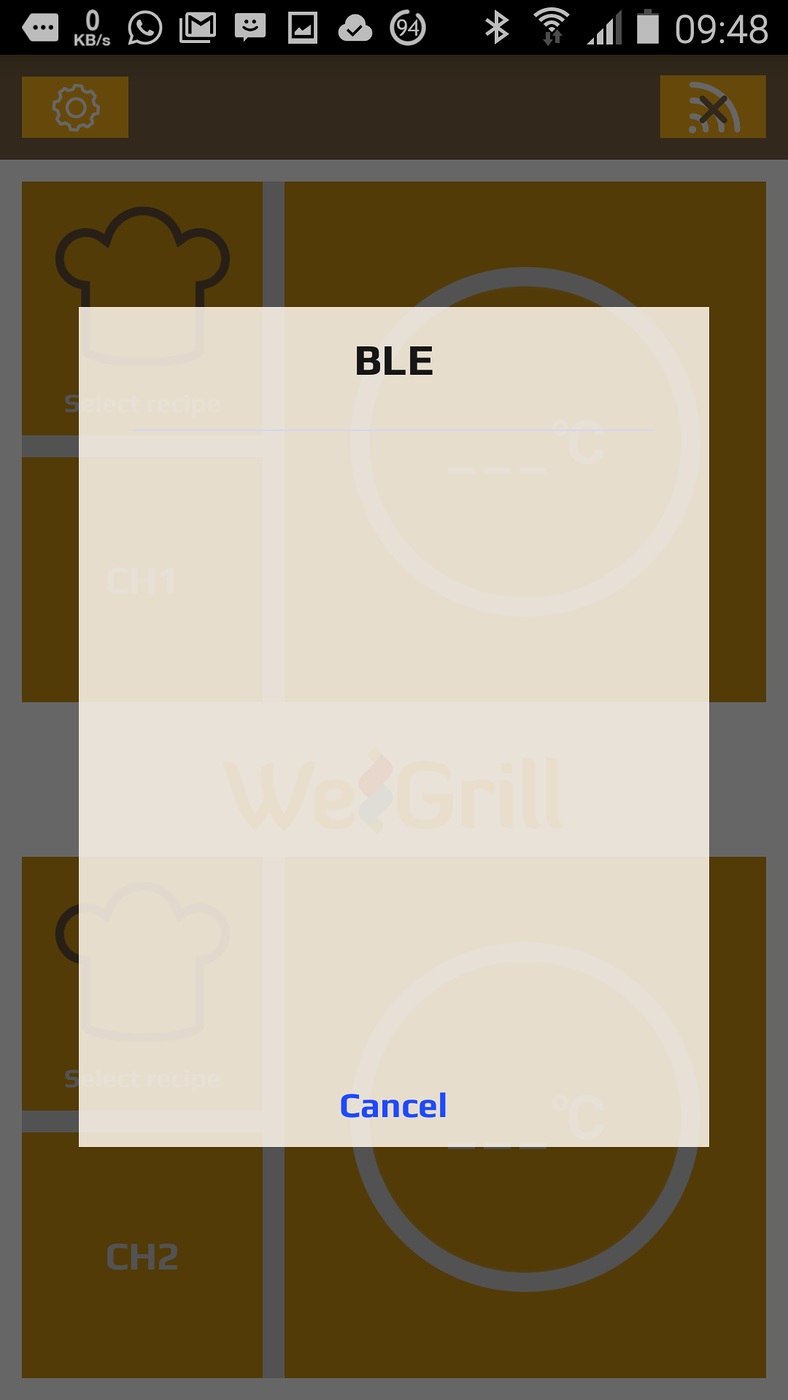 At this stage plug the probe into one of the ports of the WeGrill device, and tap on the central button on the device. An orange light will rotate around the button on the device (it is trying to pair via bluetooth, with the WeGrill app). The pop-up screen on the phone will change to the following: